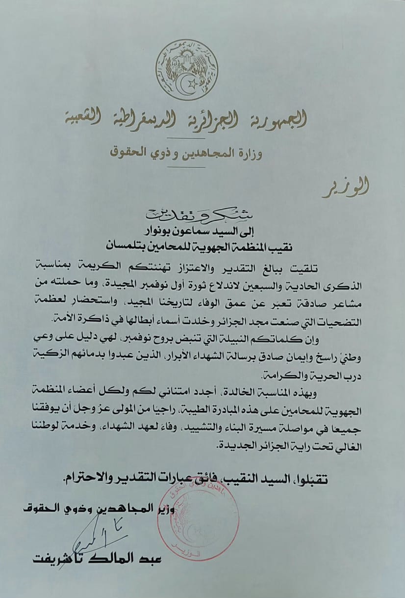 شكر و تقدير من طرف السيد وزير المجاهدين و ذوي الحقوق للسيد النقيب و السادة أعضاء مجلس المنظمة